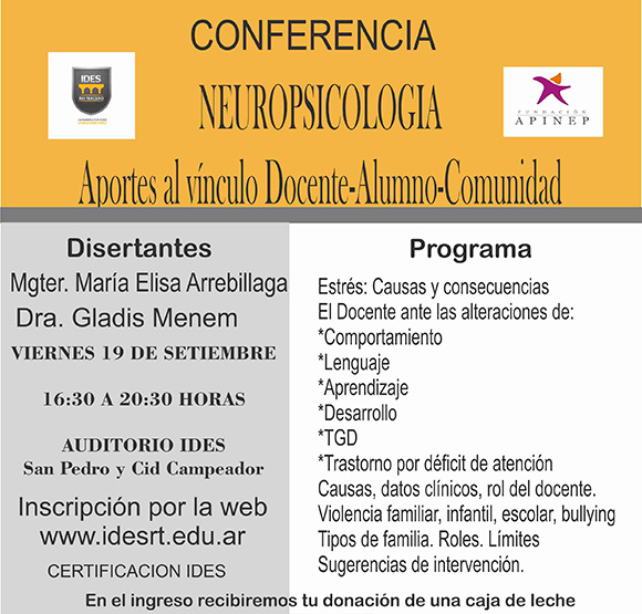 FUNDACION APINEP, invitan a Docentes, Profesionales vinculados a la temática y estudiantes de carreras afines a la Conferencia a desarrollarse en el Auditorio del IDES RIO TERCERO, sito en San Pedro y Cid Campeador donde disertarán: