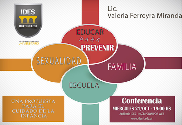 El IDES Río Tercero, desde el Área de Relaciones Institucionales, invita a la comunidad de nuestra ciudad y zona, a la Conferencia "Sexualidad, Familia y Escuela" Una propuesta para el cuidado de la Infancia, a desarrollarse en el AUDITORIO IDES, sito en San Pedro y Cid Campeador de nuestra localidad, el
